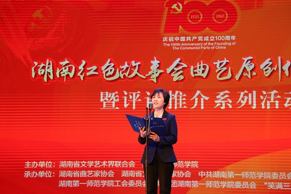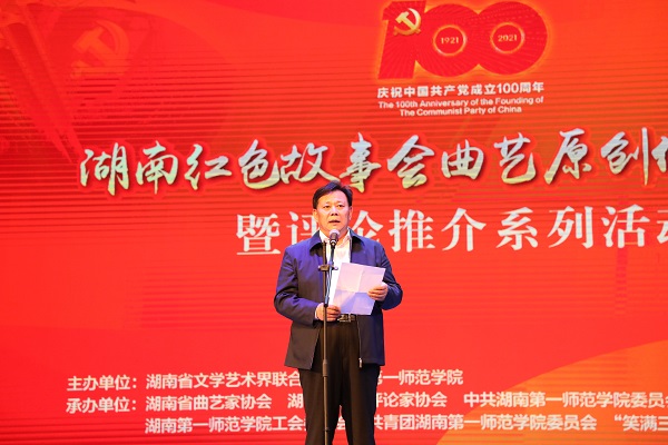 鄢福初在讲话中表示,湖南一师是名副其实的红色革命摇篮,我们在红色五月,通过在红色学院讲红色故事,来追循伟人足迹,缅怀前辈功勋,重温革命精神,传承红色基因,是文艺人的荣光,更是我们新一代人的责任。今年是建党100周年,我们一定要遵循习近平总书记考察湖南的重要讲话精神,教育引导广大党员、干部筑牢信仰之基、补足精神之钙、把稳思想之舵,讲好湖南红色故事,根据湖湘文化精神,用丰富的文艺形式、曲艺的样式为湖南庆祝建党100周年营造良好氛围,为我省实施“三高四新”战略、建设现代化新湖南贡献文艺的智慧和力量。